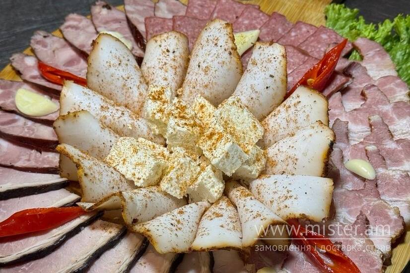 М`ясна нарізка: домашня ковбаса, домашня підчеревина, балик, сало, бринза, часник, салямі.