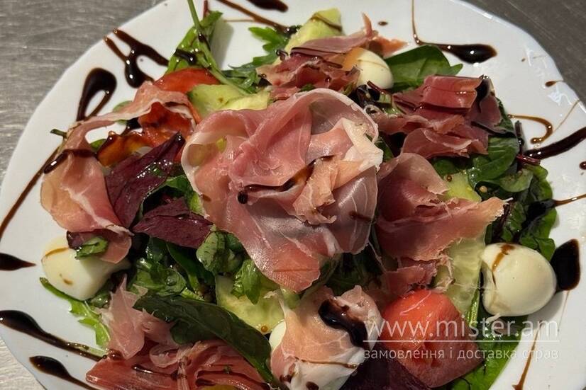Помідори чері, яйця перепелині, огірки, сировялене м`ясо. заправка: мед, гірчиця зернова, оцет бальзамічний.