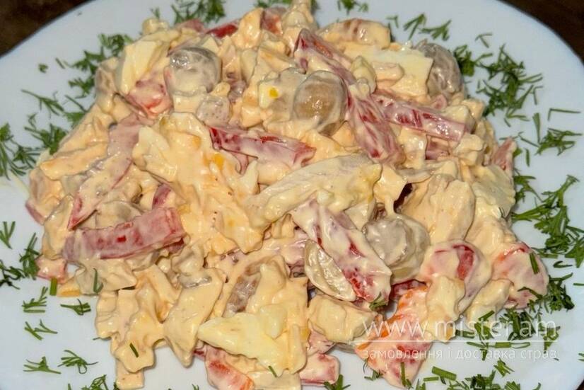 Сир твердий, гриби мариновані, перець болгарський, яйце, майонез, куряче філе.