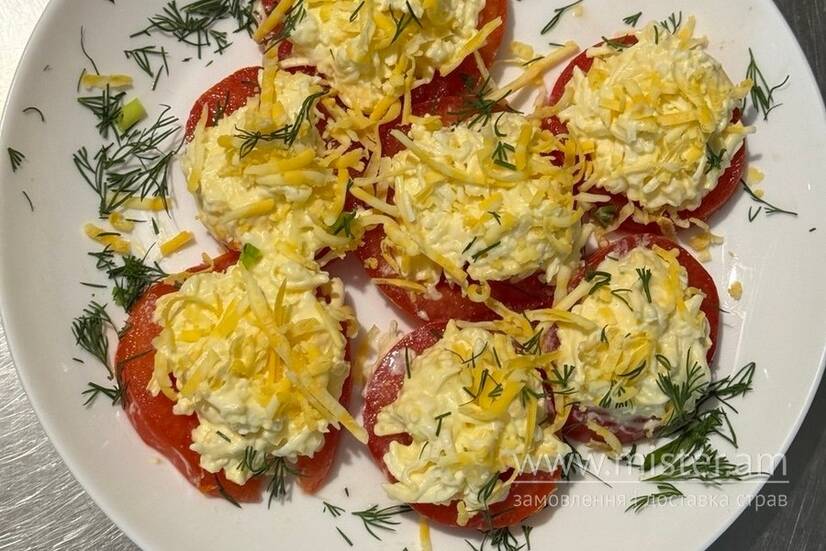 Помідори, сир плавлений, майонез, сир твердий, яйце, часник.