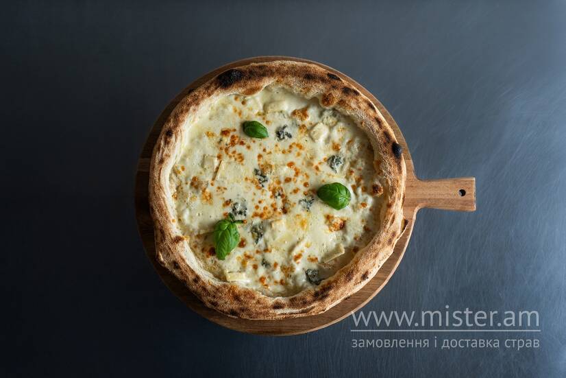 Неаполітанське тісто, вершкова основа, сир Моцарела, сир Брі, сир Дорблю, сир Пармезан. Ця піца для справжніх поціновувачів сиру! Вершкова основа з величезною кількістю ніжної Моцарели, поєднаної з вишуканими сирами Брі, Дорблю та Пармезаном. Кожен шматок – це справжній сирний вибух, гармонійно підкреслений свіжим базиліком. Ідеальний вибір для тих, хто не боїться сиру!