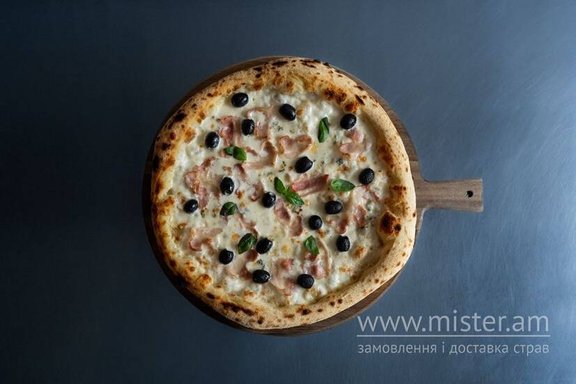 Ніжність вершків, потужна сила бекону й благородна глибина дор блю. Усе це — на витриманому тісті з Неаполя, з маслинами та ароматним домашнім базиліком.