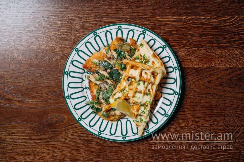 Вафлі з шніцелем та сирним соусом