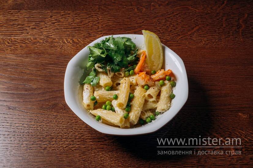 Ніжна паста у вершково-лимонному соусі з соковитими креветками, зеленим горошком, пряною зеленню та тертим пармезаном.