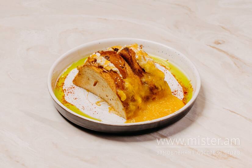 Хрусткий сендвіч з ніжною, тягучою сирною начинкою, доповнений апельсиновим мармеладом власного виробництва. Легка пікантність від чилі й справжній сирний кайф.