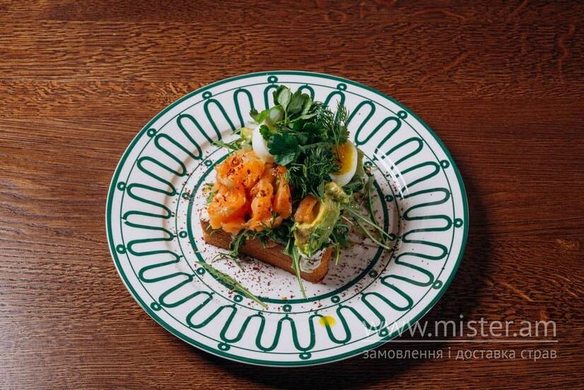 Свіжоспечена бріош із ніжним лимонним крем-сиром, слабосоленим лососем, яйцем, авокадо, руколою та міксом зелені. Заправлено соусом із базиліка та м’яти, зеленою олією, приправлено сіллю, меленим чорним перцем і посипано кунжутом та насінням льону.