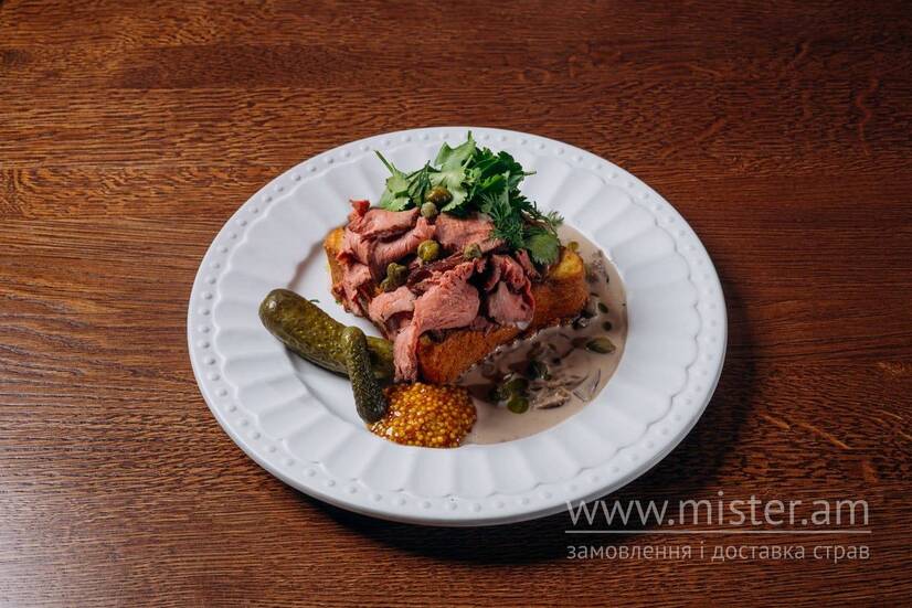 Пухка бріош у хрусткому клярі з соковитим ростбіфом, маринованою цибулею та огірками, каперсами й міксом зелені. Подається з ніжним цибулевим соусом на основі вершків, приправлена чорним меленим перцем.