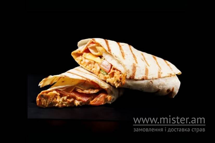 Тортилья, шашлик курячий, коул-слоу салат, сир чедер, помідор бургер, соус папрік, соус часниковий.