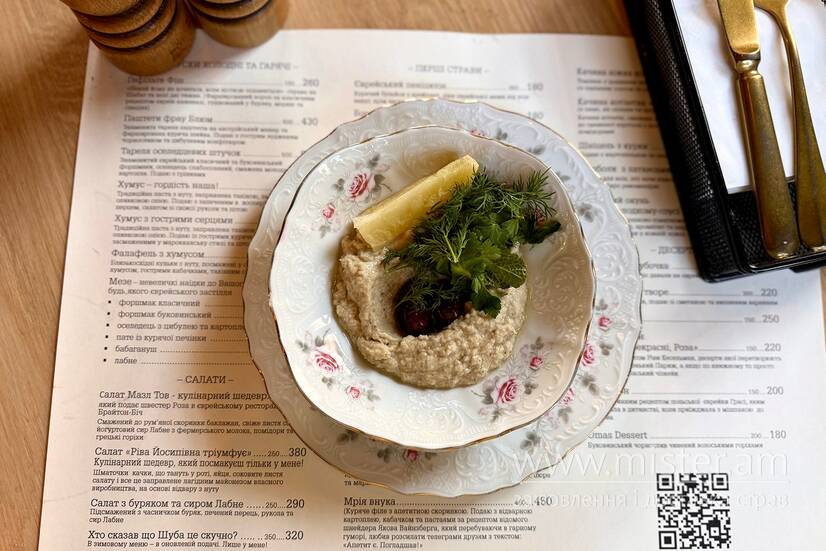 Закуски холодні та гарячі: Гефільте фіш, Паштети фрау Блюм, Тареля оселедцевих штучок, Хумус - гордість наша!, Хумус з гострими серцями, Перець у сметані, Хациль по-чернівецьки, Фалафель з хумусом, Форшмак класичний, Форшмак буковинський, Оселедець з цибулею та картоплею, Пате із курячої печінки, Лабне