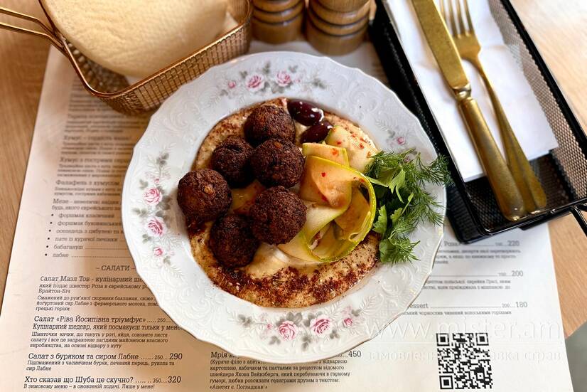 Близькосхідні кульки з нуту, посмажені у фритюрі. Подаємо з хумусом, гострими кабачками, тахінним соусом та пітою.