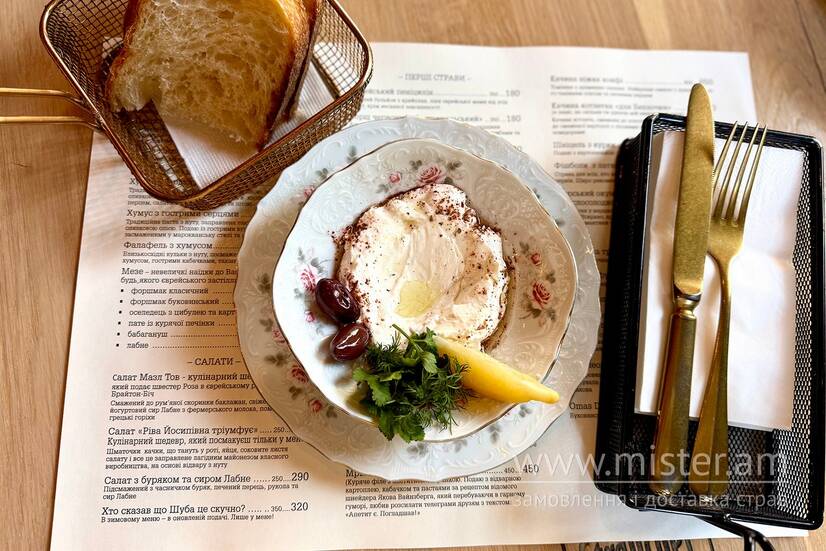 Закуски холодні та гарячі: Гефільте фіш, Паштети фрау Блюм, Тареля оселедцевих штучок, Хумус - гордість наша!, Хумус з гострими серцями, Перець у сметані, Хациль по-чернівецьки, Фалафель з хумусом, Форшмак класичний, Форшмак буковинський, Оселедець з цибулею та картоплею, Пате із курячої печінки, Бабагануш