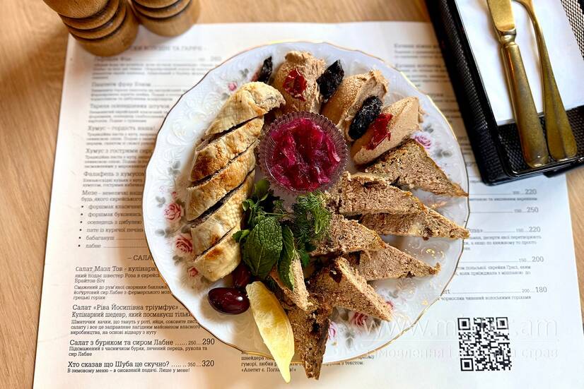 Знаменита тареля паштетів на австрійський манер та фарширована куряча шийка. Подаємо з гострим вудженим чорносливом та цибулевим конфітюром.
