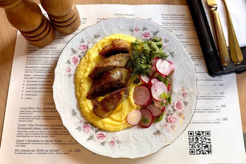 Знаменита фарширована куряча шийка, зроблена за правильним єврейським рецептом. Подаємо з картопляним пюре та салатиком з редису та зеленої цибулі.
