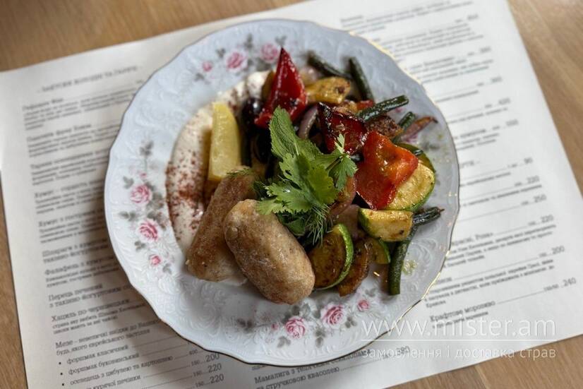 Ніжні всередині, зі смачною скоринкою ззовні. До них підсмажені овочі, як на родинному пікніку під Чернівцями. Завершую страву тахінно-йогуртовим соусом, освіжаючим, як анекдот тещі під час посту.