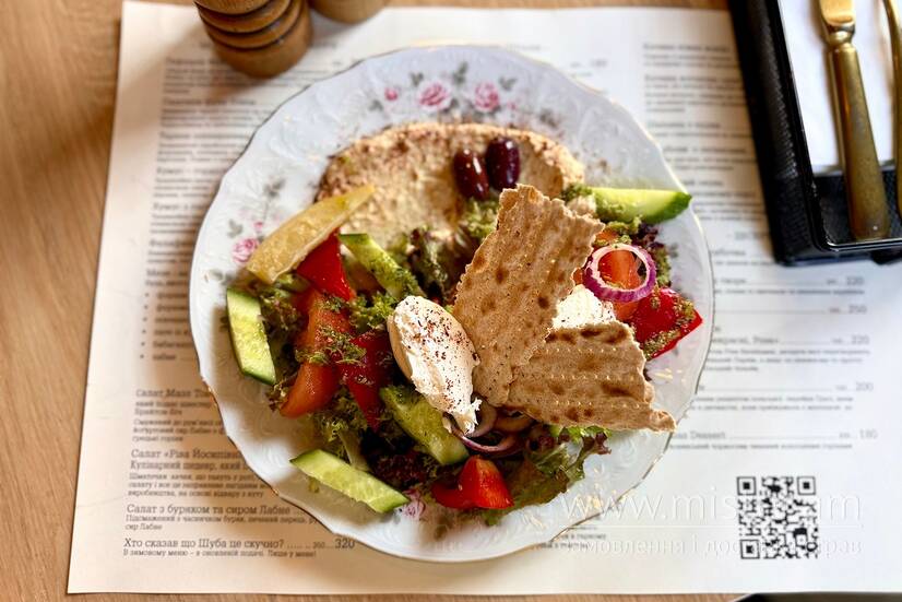 Файна салатка зі свіжих овочів, сиру фета з хумусом, приправлена фірмовою заправкою Белли Розенфельд.