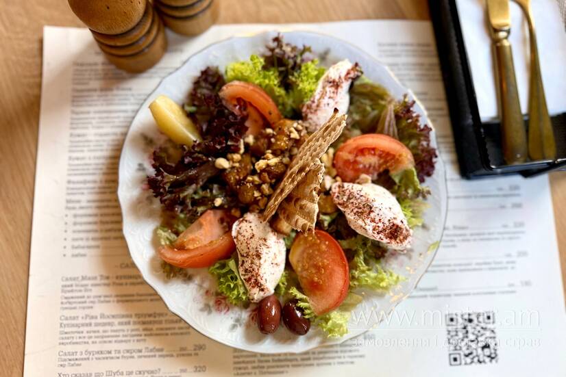 Який подає швестер Роза в єврейському ресторані на Брайтон-Біч. Смажений до рум’яної скоринки баклажан, свіже листя салату, йогуртовий сир Лабне з фермерського молока, помідори та грецькі горіхи.