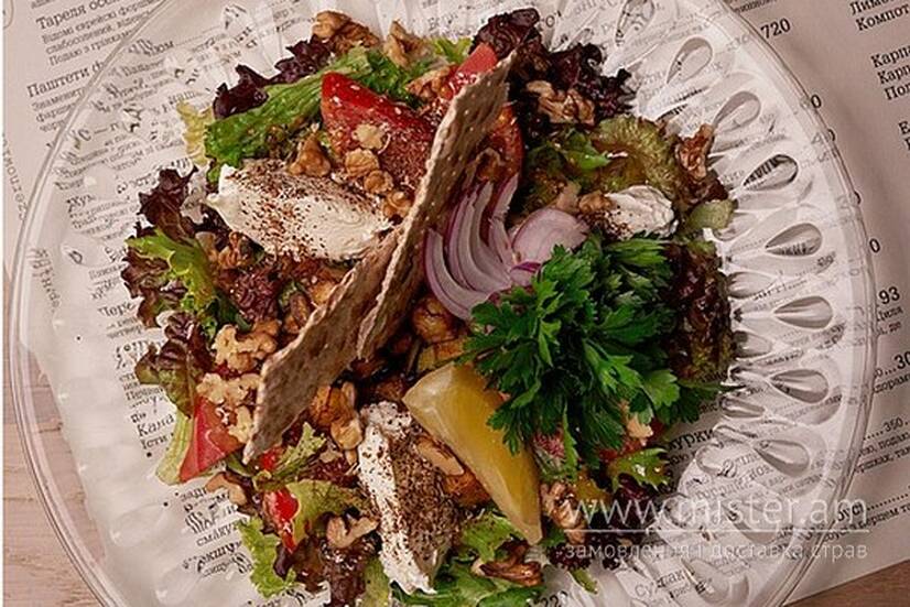 Який подає швестер Роза в єврейському ресторані на Брайтон-Біч. Смажений до рум’яної скоринки баклажан, свіже листя салату, йогуртовий сир Лабне з фермерського молока, помідори та грецькі горіхи.
