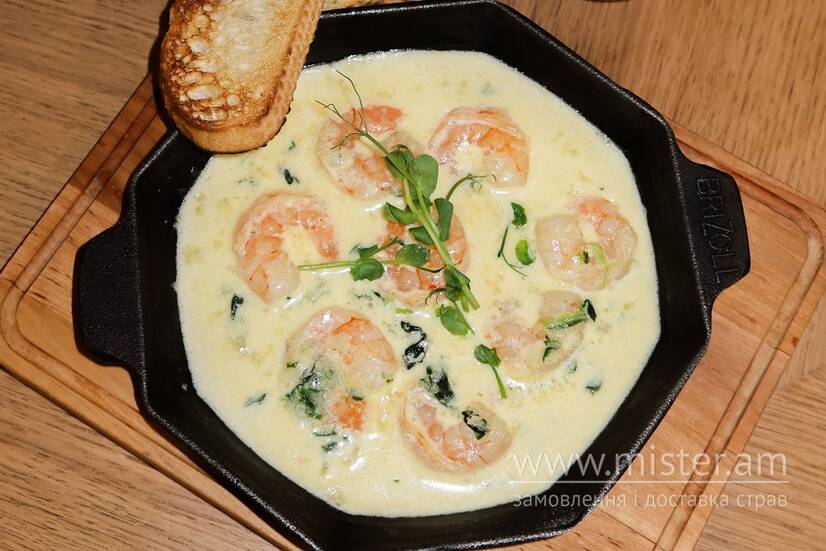Креветка, вершки, сир дор блю, пармезан, шпинат.