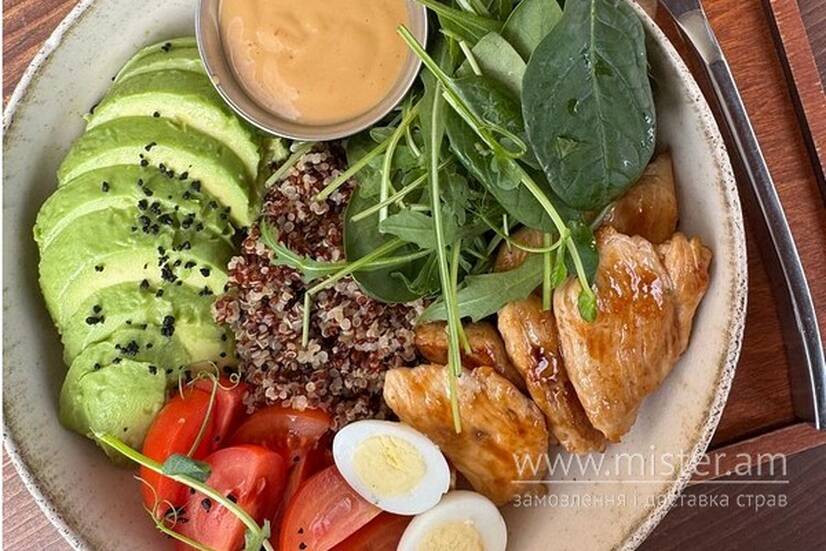 Кіноа, авокадо, томати чері, яйце перепелине, мікс салату, соус шрірача-майо.