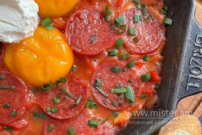 Овочеве рагу з томатами, жовтки, салямі Пепероні, крем-сир, зелена цибуля, хлібчик.