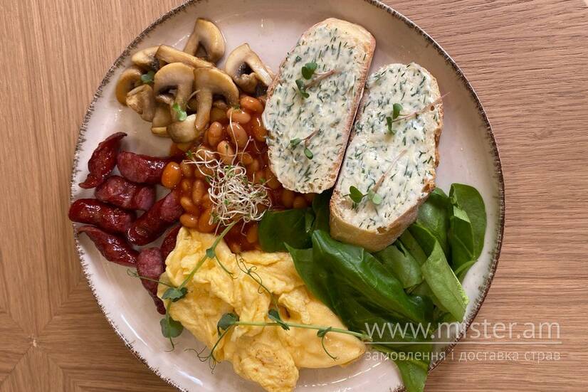 Скрембл чи яєчня, ковбаски, гриби, квасоля, хліб з вершковим.