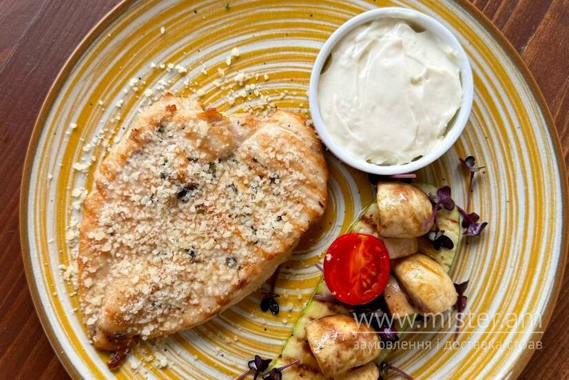 Куряче філе, сир пармезан, соус дорблю, кабачок, шампіньони, черрі.