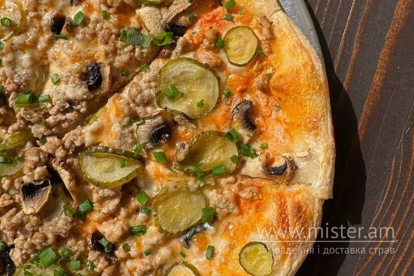 Томатна вершкова основа, моцарелла, фарш, мариновані огірки, печериці.