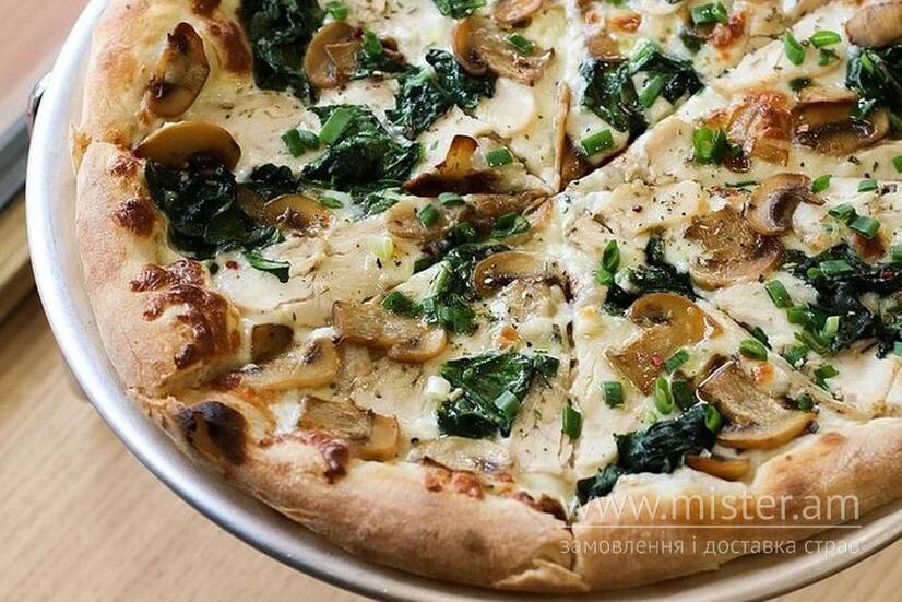 Вершкова основа, сир моцарела, курка, смажені гриби, шпинат, зелена цибуля.