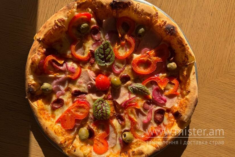 Томатна основа, моцарела, шинка, мисливські ковбаски, маринована червона цибуля, оливки, болгарський перець.