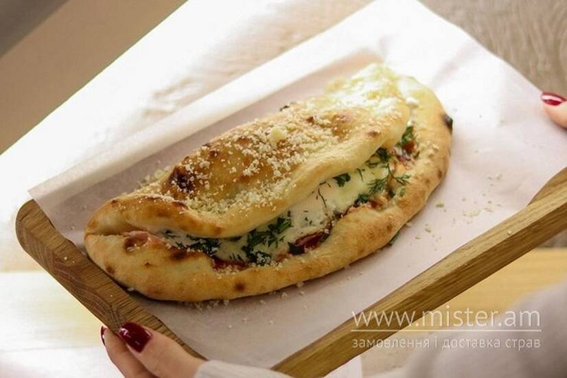 Коржик, шинка, бекон, томатний соус, моцарела, соус грецький, яйце смажене.