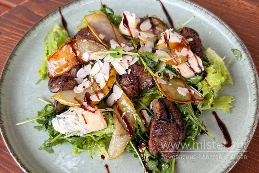 Мікс салату, медово-гірчичний соус, куряча печінка, карамелізована груша, сир дор блю.