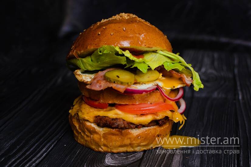 Булочка, соус червоний, соус часниковий, гірчиця американська, айсберг, яйце, сир моцарела, цибуля червона, помідори, огірок мариновиний, фарш м`ясний, грудка свиняча, цибуля фрі, шампіньйони.