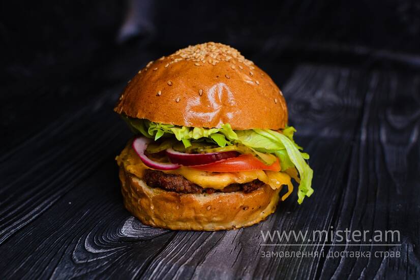Булочка, соус червоний, соус часниковий, гірчиця американська, айсберг, фарш м`ясний, помідори, огірок маринований, цибуля червона.
