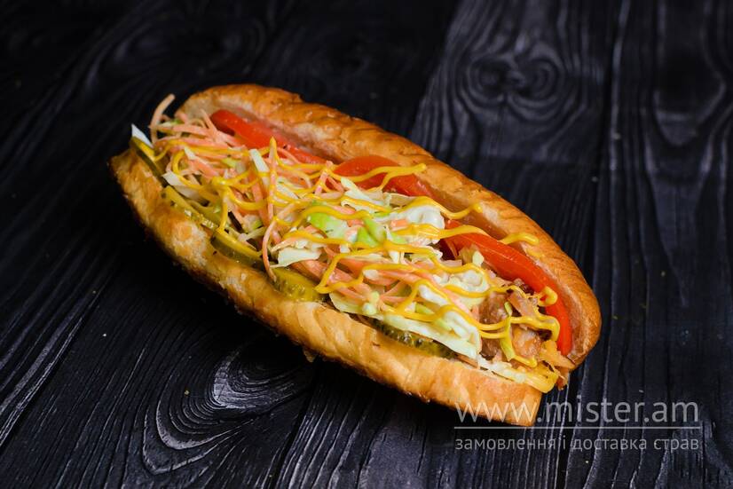 Булочка, м`ясо куряче, сир моцарела, соус червоний, соус часниковий, капуста, морква, помідори, огірок маринований, цибуля фрі.