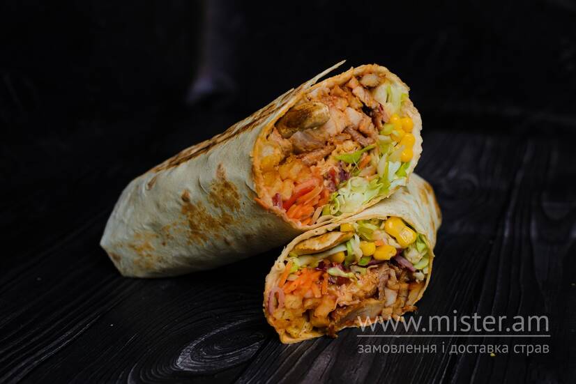 Лаваш, м`ясо куряче, капуста, морква, цибуля червона, помідори, огірок мариновиний, соус червоний, соус часниковий, сир твердий, кукурудза консервована, картопля фрі, шампіньйони.