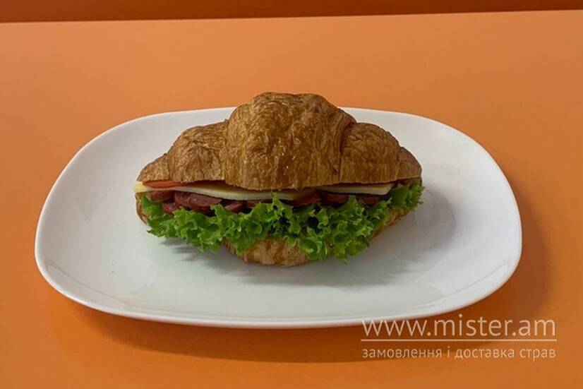 Сир Янтарик, майонез, лист салату, помідор свіжий, колбаски Баварські, сир Чедер.