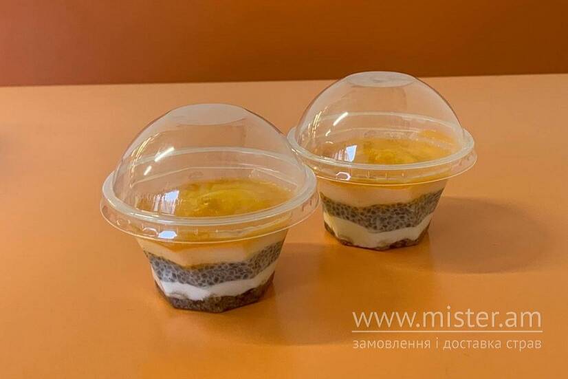 Гранола з горіхом та родзинками, зерна чіа, сирковий крем та соус манго.