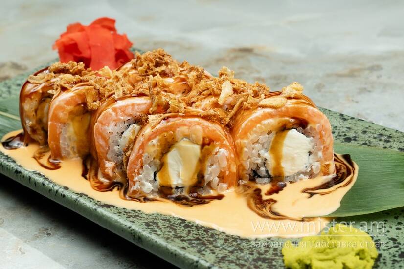 Рис, норі, лосось, кранч, соус чедр, соус унагі, крем-сир.