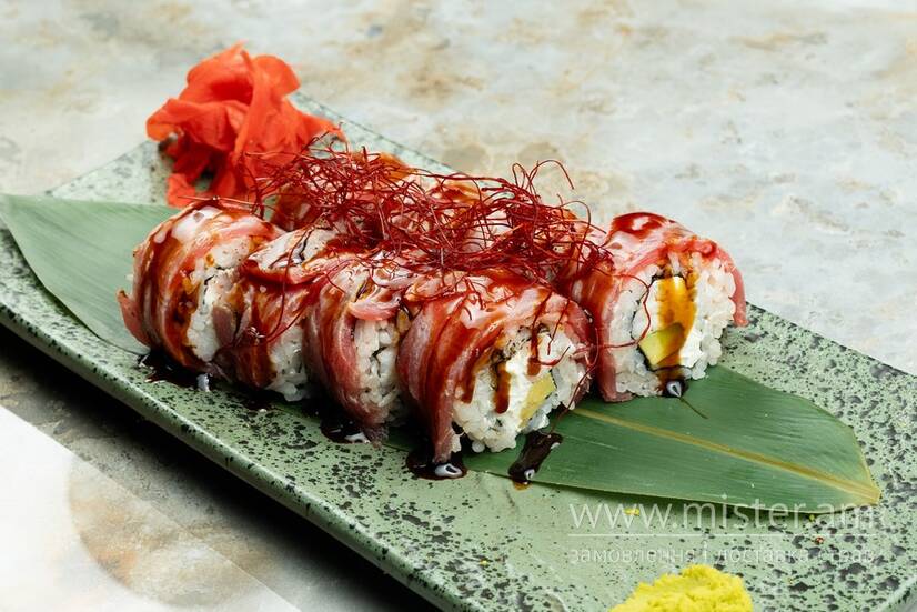 Рис, норі, тунець татакі, крем-сир, авокадо, креветка, нитки чілі.