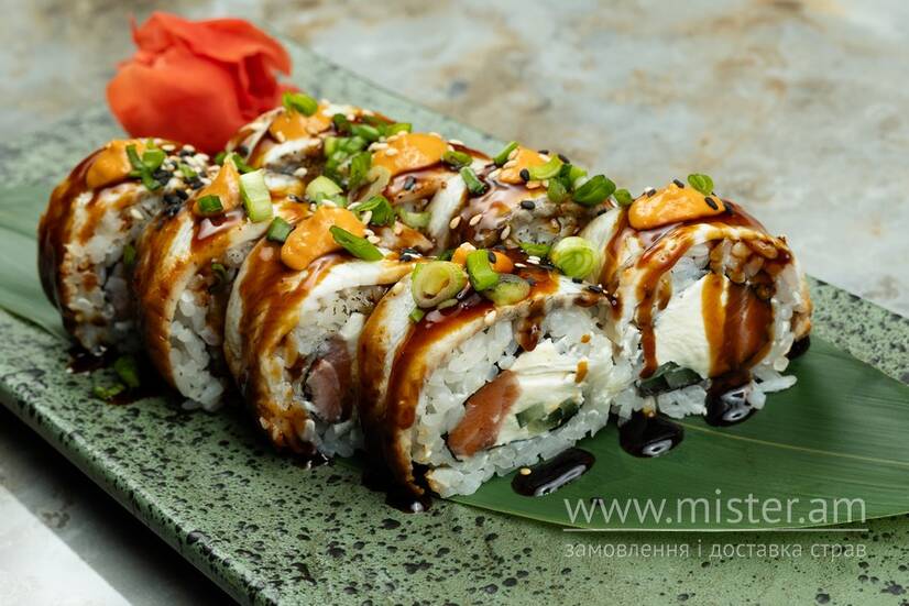 Рис, норі, вугор, соус том-ям спайсі, крем-сир, огірок, лосось, соус унагі, кунжут.