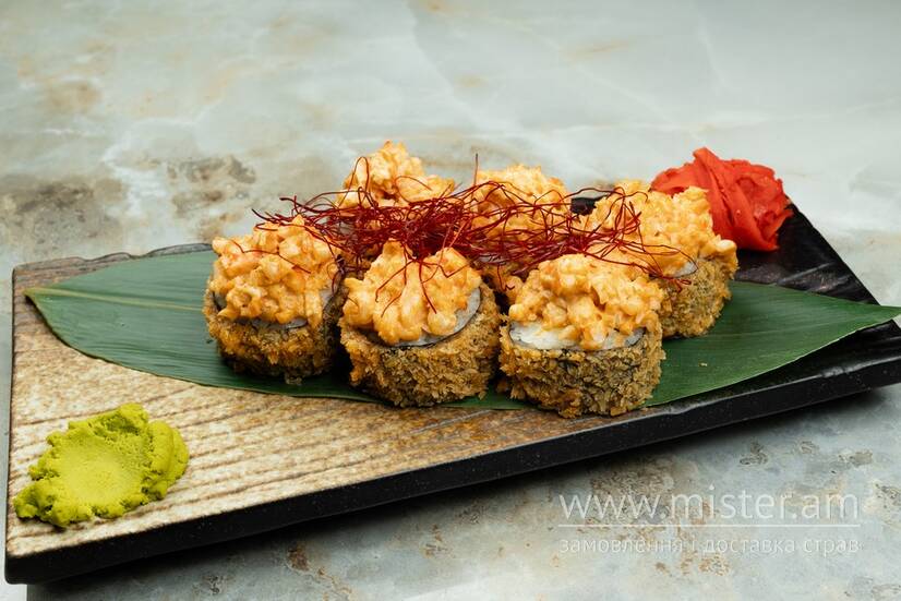 Рис, норі, огірок, крем-сир, кляр темпура, панко, тигрова креветка, соус том-ям спайсі, нитки чілі.