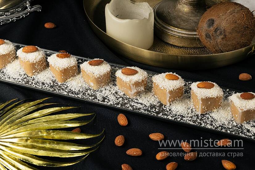 Рол з бананом, солодким крем-сиром, печивом, кокосовою стружкою та мигдалем.