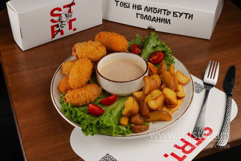 Соковита копчена сарделька в хрусткій паніровці, подається з картоплею по-селянськи, свіжими чері та міксом салату. Ідеально смакує з келихом просекко.