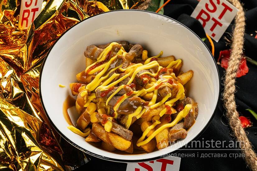 Хрустка картопля фрі з ніжною телятиною та кукурудзою, заправлена сирним соусом з пікантним доповненням соусів шрірача та темпура.