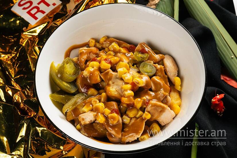 Хрустка картопля фрі з соковитим філе курки, кукурудзою та перцем халапеньйо, заправлена соусами темпура і шрірача для пікантного смакового контрасту.
