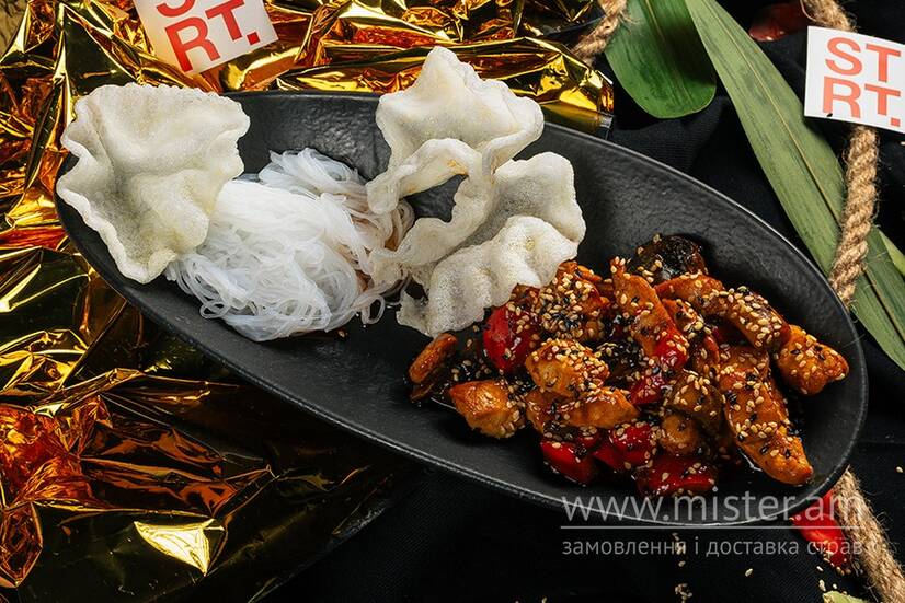 Рисова скляна локшина з філе курки, печерицями і болгарським перцем у кисло-солодкому соусі. Подається з рисовими чіпсами, кунжутом, а також соусом унагі.