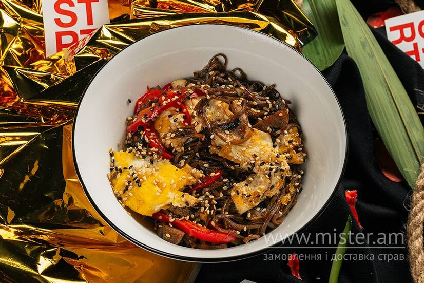Локшина соба з ніжною телятиною, болгарським перцем, скремблом, печерицями та кунжутом. Заправлена соусами унагі, соєвим і хойсин.