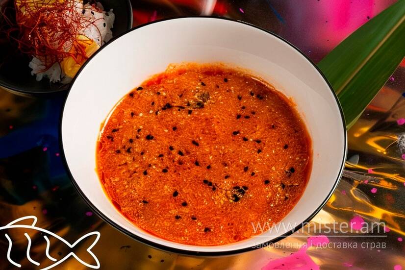 Пряний суп з том ям пастою, вершками, лососем, філе мінтая, грибами шиітаке, помідорами чері, кунжутом та нитками чилі. Подається з рисом і шматочком лайма.