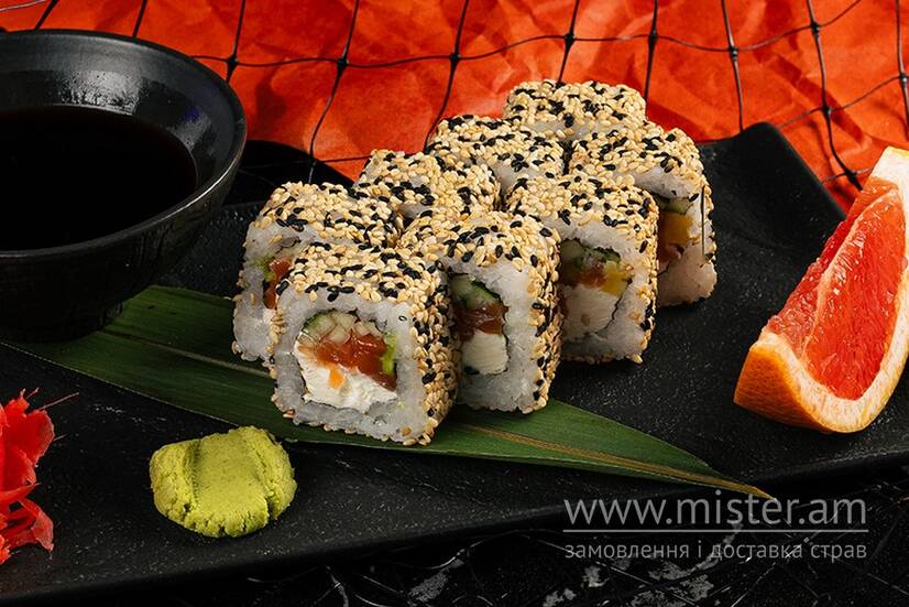 Рол з ніжним лососем, свіжим огірком, авокадо та сиром Філадельфія, присипаний кунжутом.