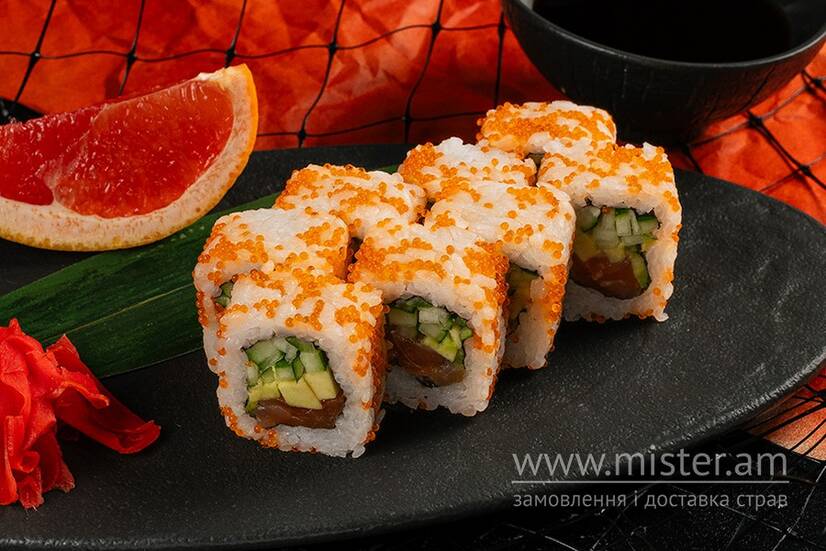 Рол з ніжним лососем, загорнутий у лист норі, свіжим авокадо і огірком з ікрою тобіко.